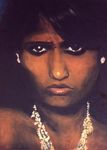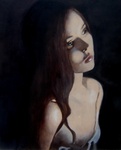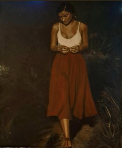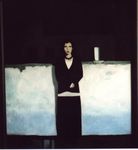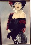 1991geheel afgebeeld (zie ook fragment).dit schilderij is gemaakt naar een fotootje uit een modetijdschrift. daar ging het niet direct om de dame, maar om de jurk. ik vond het dus een schilderij waard. het schilderij heeft een ondefinieerbare melancholische stemming.